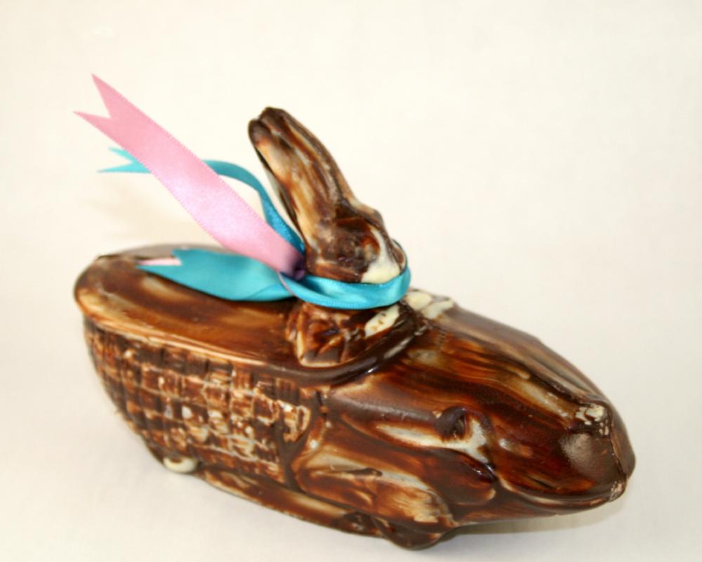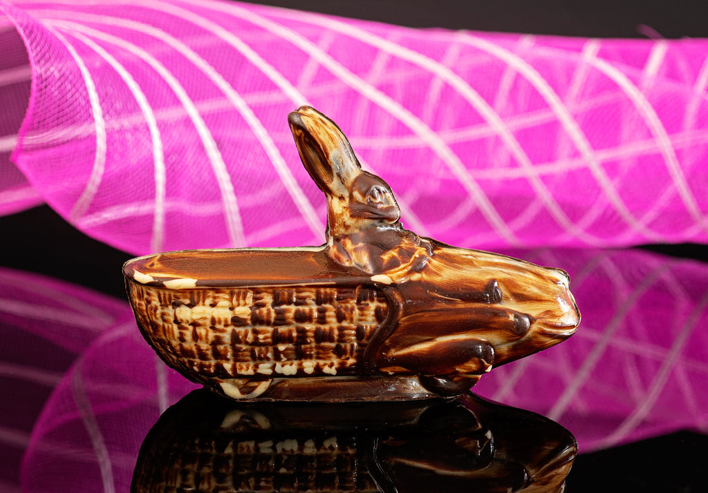 Enjoy a fabulous dark and white chocolate marbleized racer Easter bunny, made with remarkable 70% dark chocolate.